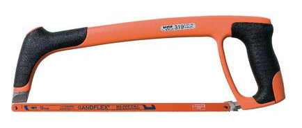 Comfortable soft handles, light steel frame with plastic casing, light frame with steel core, blade straining 100 kg, tensioning mechanism in the handle, alternative blade straining at 55° for flush cuts, with SANDFLEX® bimetal blade 300 mm 24 teeth/inch