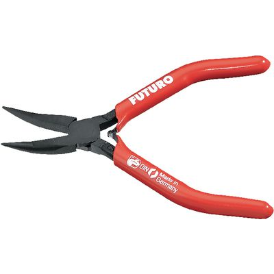 Special tool steel, drop-forged, hardened and tempered, polished, black-oxide fiish, handles PVCdipped, opening spring, smooth jaws, curved 35°.