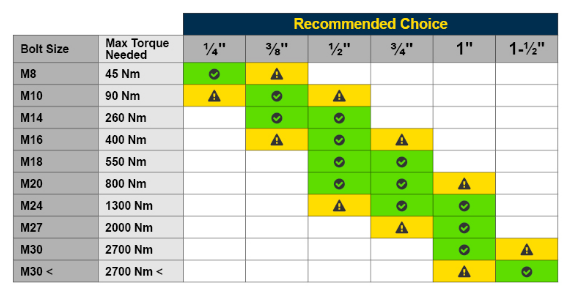 Giống như lái xe, khi cần tăng tốc thì ta phải tăng số, để đảm bảo lực siết tối ưu, chúng tôi khuyến cáo bạn chọn ô xanh trong bảng. Nó sẽ phù hợp với phần lớn nhu cầu công việc chứ không phải mô mem xoắn cực đại màu vàng. Còn nếu bạn thường xuyên sử dụng súng siết bulong với lực siết lớn nhất, ô màu vàng là sự lựa chọn phù hợp hơn.